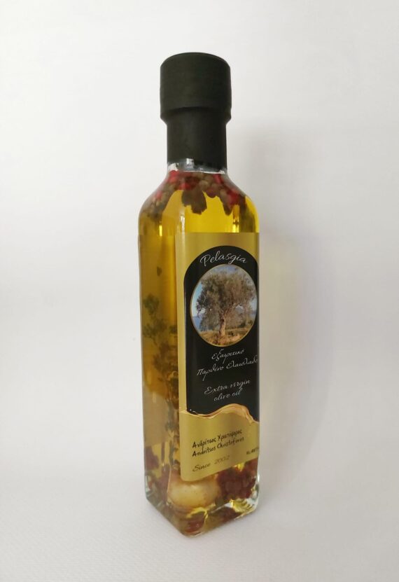 Uleiul are un gust aparte din adaugarea de mirodenii: piper mozaic, usturoi, crenguta de oregano – cunoscut in Grecia ca rigani sau cimbrisor salbatic grecesc. Condimentele atent alese fac acest ulei sa potenteze gustul oricarui preparat culinar, fie el gatit termic fie crud. Uleiul condimentat miroase puternic a usturoi, are gust puternic de usturoi si de oregano, iar piperul vine sa completeze aromele prin potentarea lor, mai ales in momentul gatitului termic.