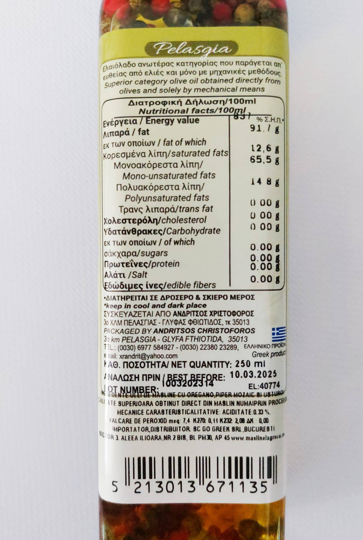 - TIP ulei de masline: ulei grecesc de masline extravirgin de categorie superioara obtinut direct din masline si exclusiv prin procedee mecanice. Uleiul Livezile Andritsos este un ulei de masline extravirgin autentic asupra caruia avem control absolut inca din faza de fruct in livada, astfel reusind sa ne asiguram ca se implementeaza toate normele necesare pentru ca uleiul pe care vi-l oferim sa fie de calitate superioara, sa fie 100% natural si respecta toate normele de igiena si sanitar veterinare impuse de Uniunea Europeana. In plus, am dorit de la inceput sa spargem miturile legate de uleiul de masline extravirgin si sa putem sa oferim pe piata romaneasca nu doar un ulei de calitate, ci un ulei care se regaseste in aceeasi forma si ambalaj si in casele noastre, ale producatorilor de ulei de masline autentici.